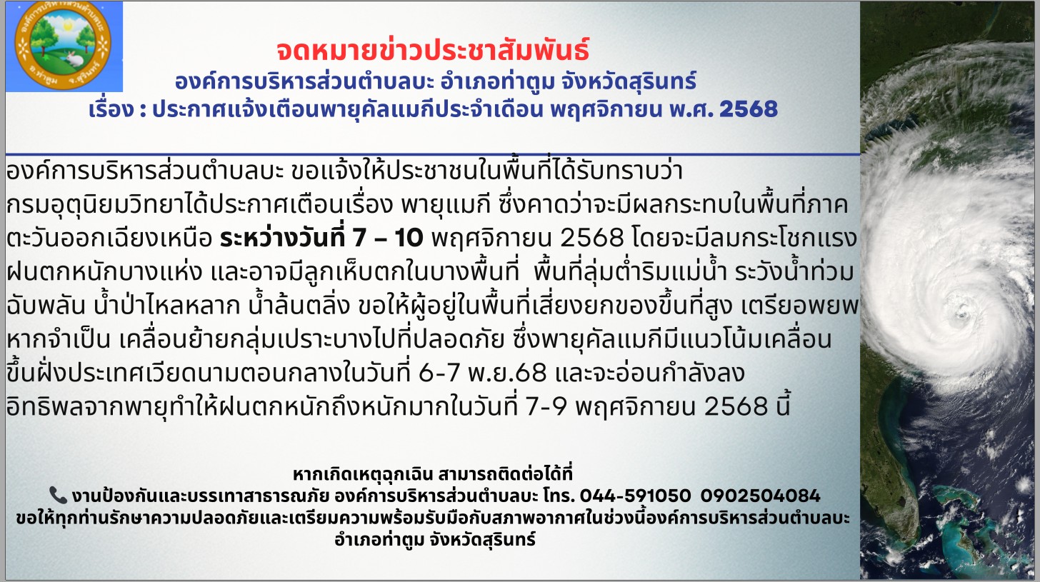 เรื่อง : ประกาศแจ้งเตือนพายุคัลแมกีประจำเดือน พฤศจิกายน พ.ศ. 2568