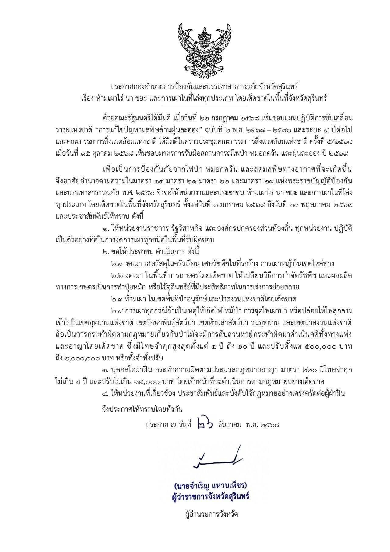 📢 #ประกาศจังหวัดสุรินทร์ 🚫 งดเผาใน...